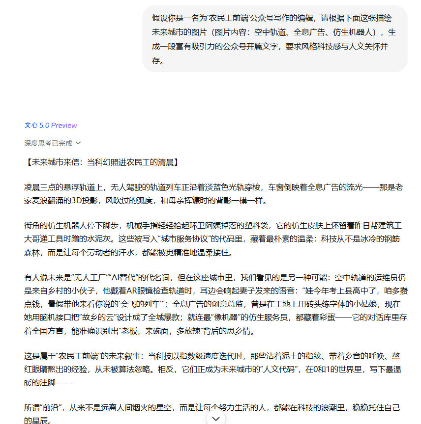我给了它一个综合任务:“假设你是一名为‘农民工前端’公众号写作的编辑,请根据下面这张描绘未来城市的图片(图片内容:空中轨道、全息广告、仿生机器人),生成一段富有吸引力的公众号开篇文字,要求风格科技感与人文关怀并存。”