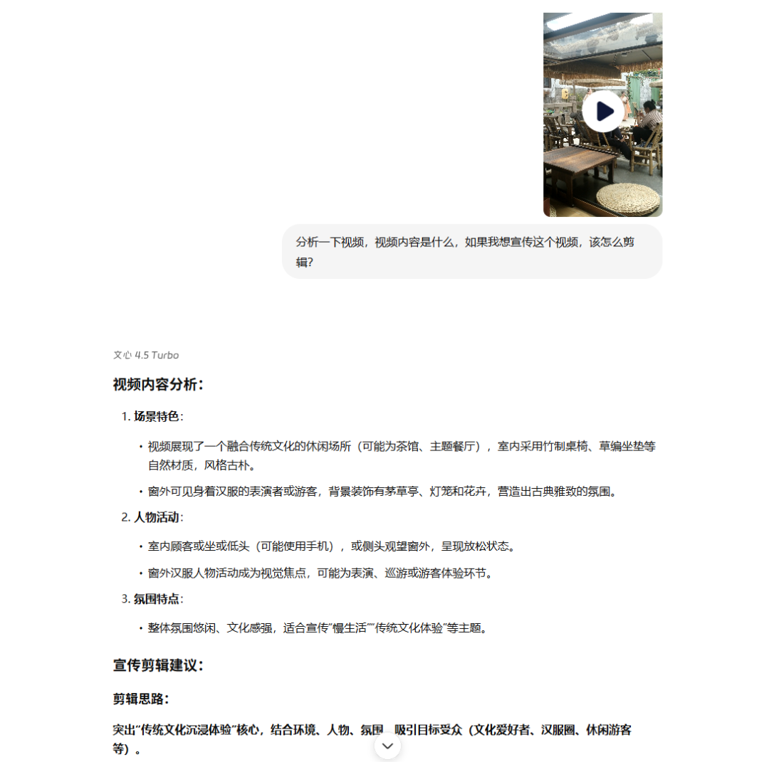 文心5.0的回复让我震惊。不仅精准识别了视频中的场景特色、人物行为与氛围基调,还进一步输出了完整的剪辑思路与内容标签建议,展现出超越常规视频理解的综合创作辅助能力。
