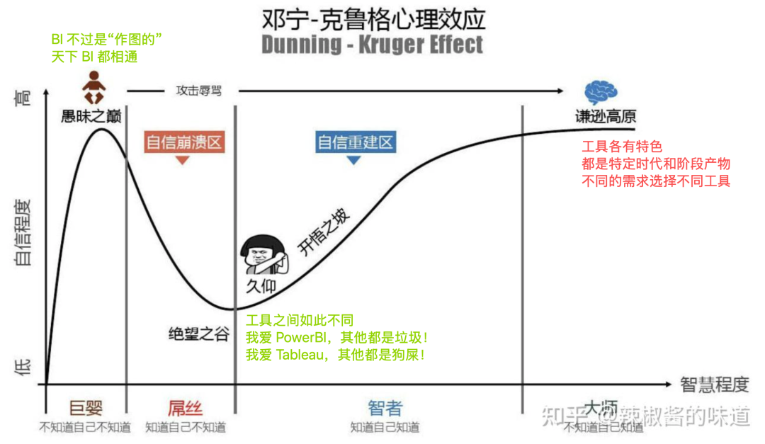 在 BI 领域,工具使用者(很多表哥表姐)在学会了一款工具后,会错误地认为自己已经理解了整个领域。他们看待其他工具,不过是自己熟悉工具的“换皮”版本。他们的思维模式是纯粹程序化的:“将字段 A 拖到画布 B,得到图表 C”。他们缺乏必要的“元认知能力”(metacognitive ability)来识别自身能力的不足,这被称为“双重负担”:那些让你表现不佳的技能缺失,恰恰也是让你无法评估自身表现的技能缺失 。