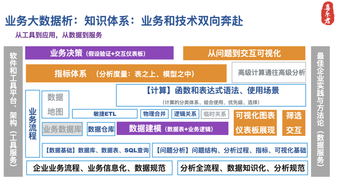 在过去多年的学习和实践中,我也与国内多家 BI 建立了不同形式的合作,我常常用下面的图来展示分析世界“业务”和“技术”两个方向的关键知识点,它们是相通于不同工具的——只是有些工具暂时没有达到足够的高度。