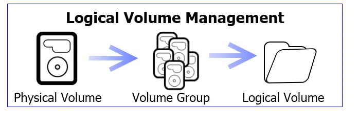 如下图,LVM通过3层抽象来管理存储空间,分别是物理卷PV(physical volume)、卷组VG(volume group)、逻辑卷LV(logical volume)。