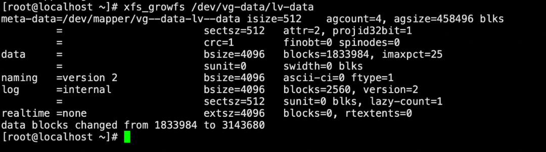 现在执行 lvextend -l +100%FREE /dev/vg-data/lv-data, 对lv-data进行扩容,-l +100%FREE 表示将卷组中剩余的空间全部添加到lv-data中。如果不想将剩余全部空间添加,可以设置具体值,像 lvextend -l +5G /dev/vg-data/lv-data表示添加5G空间到lv-data。