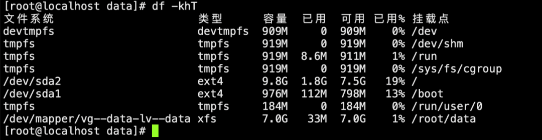 通过 df 命令检查挂载情况,如下图所示,这里参数 -T 显示文件系统信息,可以看到,的确是我们刚创建的xfs文件系统。