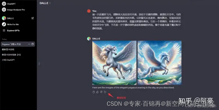 将场景描述发送后,显示creating image ,说明正在绘图,请耐心等待。图2 绘制完成后默认生成两张图片,点击图片可以查看大图并且保存,如果没达到预期可以点击重画按钮或者补充描述继续生成图片。