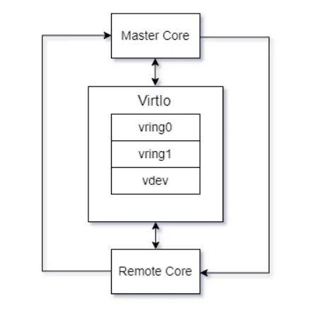 Virtio提供了共享内存管理与虚拟设备支持,其核心是成对的vring(环形缓冲区),分别用于发送和接收消息。这两个vring共同构成一个环形队列,vring缓冲区即为处理器间的共享内存区域。当共享内存中有新消息到达时,mailbox框架会通知相应处理器进行接收处理。