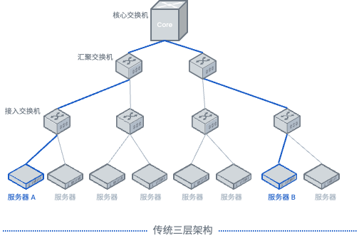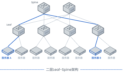 为适应东西向数据流和低延迟需求,数据中心也从传统的三层架构向Spine-Leaf架构演进。在Spine-Leaf架构中,每一台leaf交换机都连接到每一台spine交换机,减少了数据过程中虚拟服务器间的交换机跳数,并显著降低了延迟,同时当服务器A需要与服务器B“通讯”时,还可提供下图所示更好的冗余性。