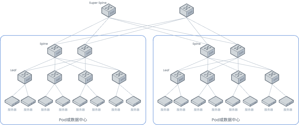 进一步地,超级Spine架构通过二级Spine互联多个Spine-Leaf网络,实现模块化扩展,支持数据中心互联(DCI),满足大规模云服务需求。同时,边缘数据中心的兴起为5G和实时应用提供本地数据处理,推动对400G连接的需求,以聚合数据并回传至核心云数据中心。