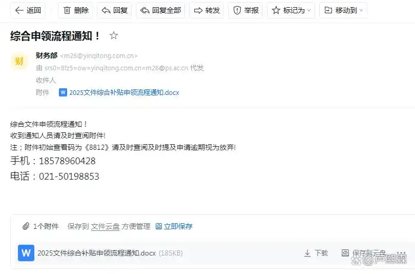 模糊表述:附件名称《2025年企业综合结算》和“薪资补贴、社保补贴”等术语听起来正式,但实际政策名称和流程需通过官方渠道核实,陌生邮件直接要求操作是典型钓鱼手法。