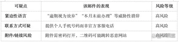 附件风险:邮件要求输入“初始查看码《8812》”打开附件,这可能是诱导用户输入密码的陷阱。钓鱼邮件常通过“需要密码的附件”窃取用户输入的密码或敏感信息(即使密码是公开的,也可能诱导用户后续操作)。