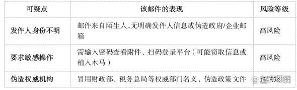 核心风险:通过伪造政府政策、制造紧迫性、诱导用户操作附件或扫码,最终窃取个人信息或资金。