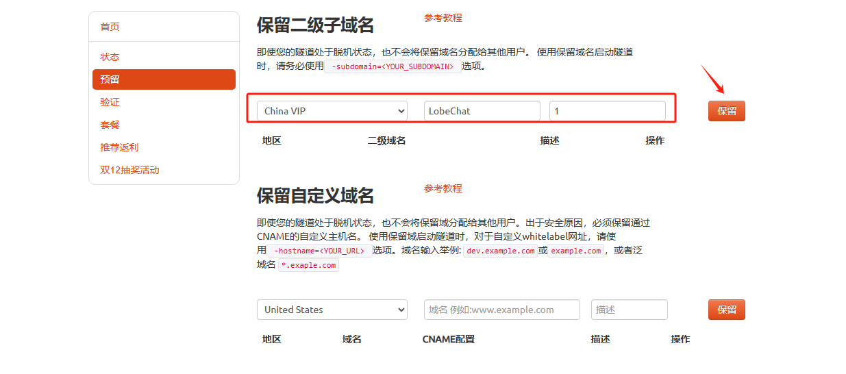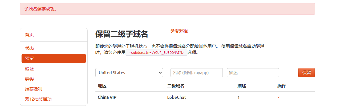 如果我们需要长期进行团队协作的话,由于刚才创建的是随机的地址,24小时会发生变化。另外它的网址是由随机字符生成,不容易记忆。如果想把域名变成固定的二级子域名,并且不想每次都重新创建隧道来访问LobeChat,我们可以选择创建一个固定的http地址来解决这个问题。