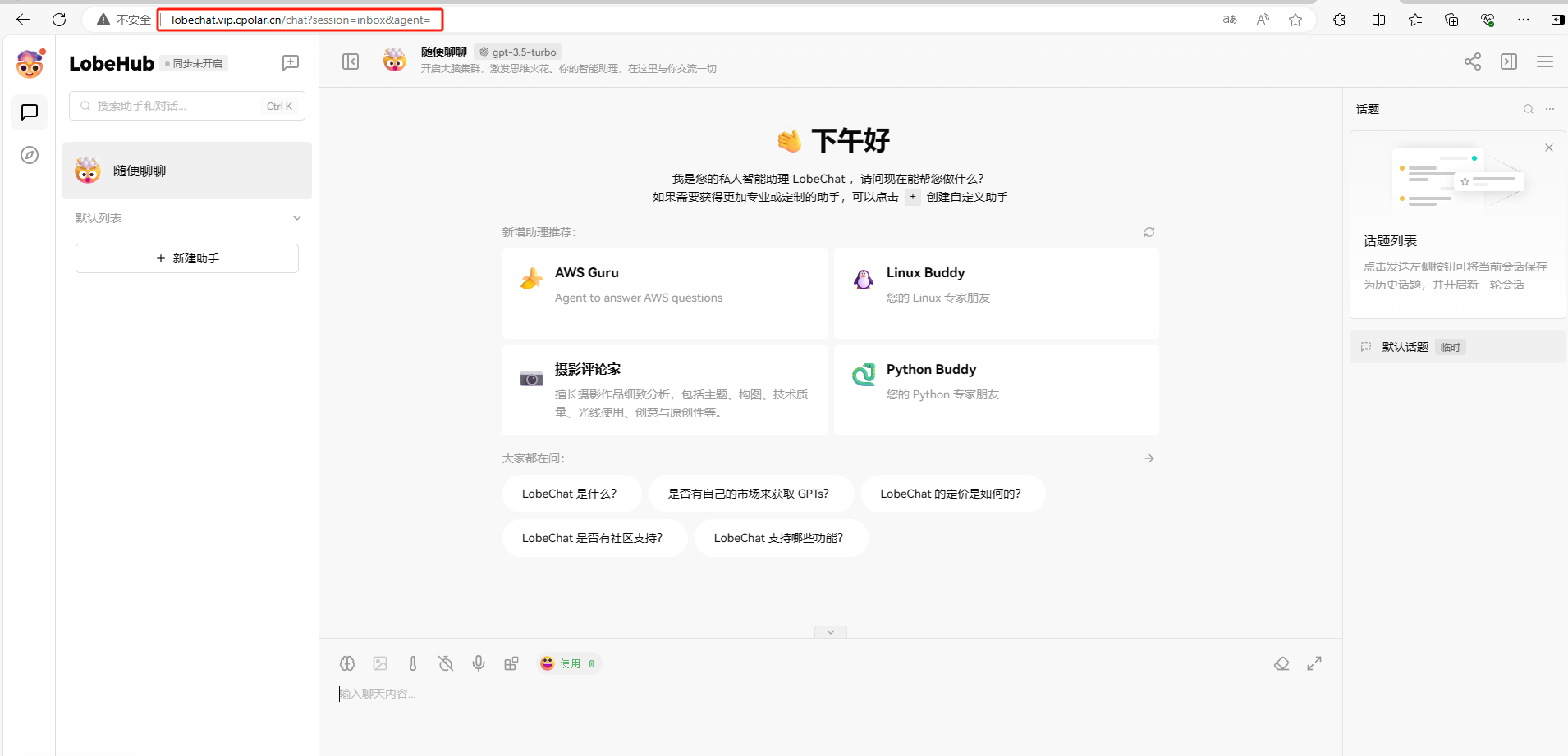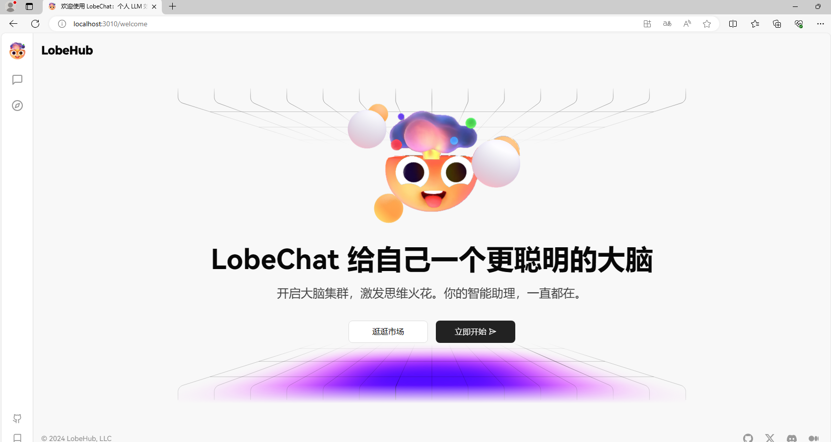 可以看到我们已经在本地部署了LobeChat,测试一下是否部署成功打开新的浏览器输入:http://localhost:3010