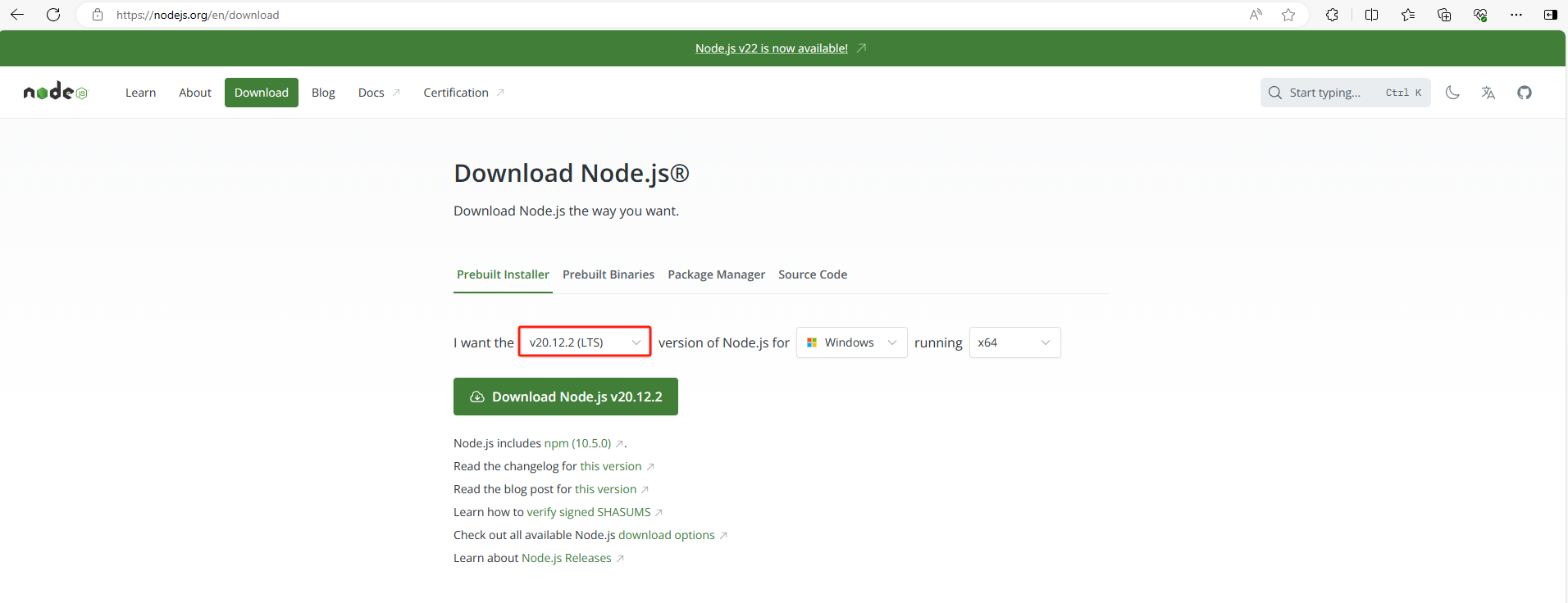 (注意:没有安装Node.js的话,点击官网下载链接https://nodejs.org/en/download,这里演示版本是v20.12.2)