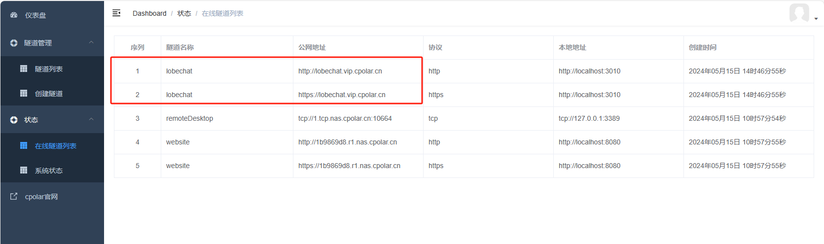 隧道创建成功后,点击左侧的状态——在线隧道列表,查看所生成的公网访问地址,有两种访问方式,一种是http 和https