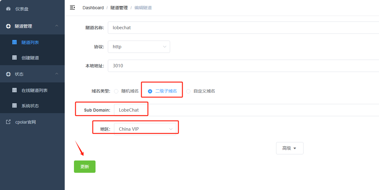 修改隧道信息,将保留成功的二级子域名配置到隧道中