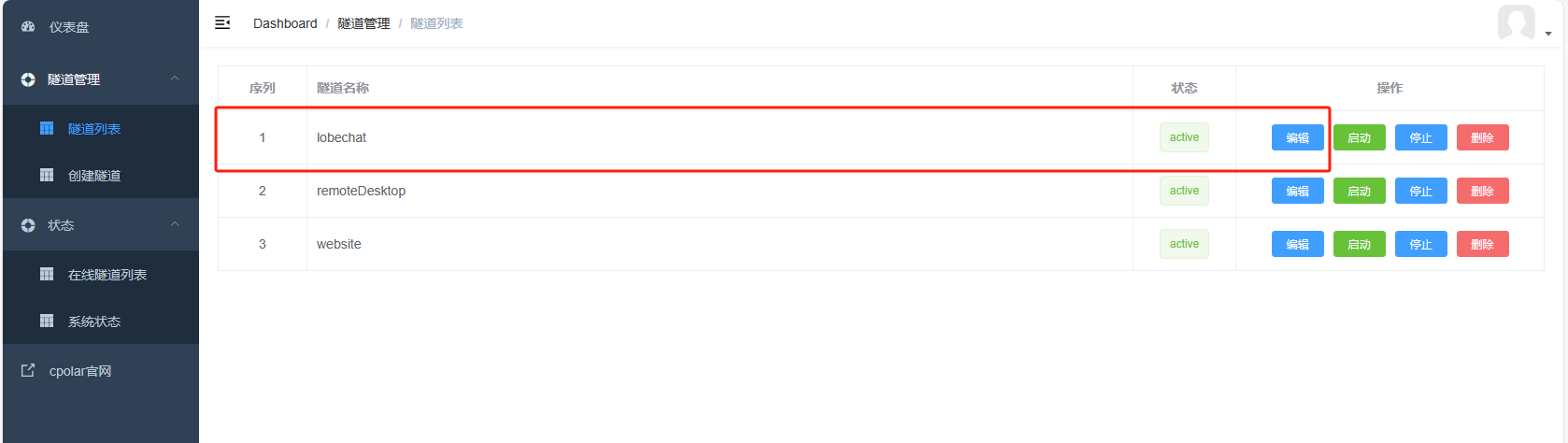 返回登录Cpolar web UI管理界面,点击左侧仪表盘的隧道管理——隧道列表,找到所要配置的隧道,点击右侧的编辑