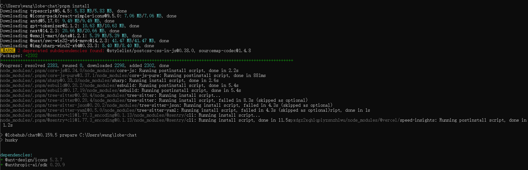 cd lobe-chat在项目的根目录下,执行下面的命令,下载依赖。