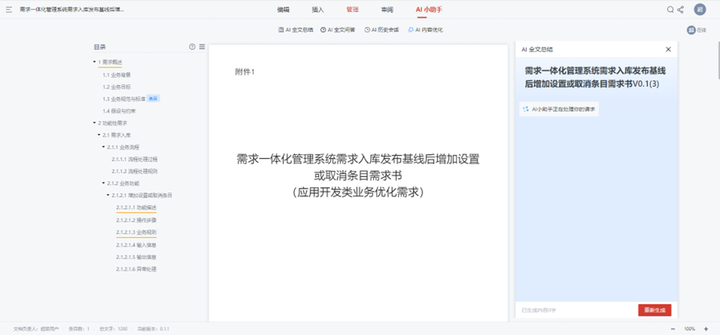 1. AI 全文总结:文档编写完成后,AI 自动提炼核心内容,生成 “100 字以内摘要 + 关键功能清单”,帮助快速把握文档重点,尤其适用于长文档(如 50 页以上的系统需求说明书);