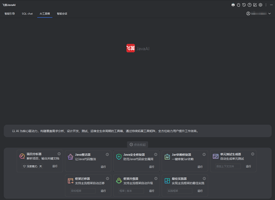 试到第 15 款,也就是飞算JavaAI 时,我才真正被惊艳到。它最牛的地方在于只做 Java 一种语言,从 IDE 插件到功能设计,全是为 Java 开发者量身打造的。打开它的 AI 工具箱,8 个功能点直接戳中 Java 开发的核心需求,每一个都精准解决通用 AI 搞不定的问题,而且完全贴合官方文档对各工具的定位: