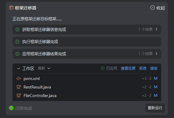 跟框架迁移器不同,框架升级器专注于同框架的版本迭代,比如把 Spring Boot 2.2 升到 2.7,把 Java 8 升到 Java 11。它会自动处理新版本的 API 变更(比如 Spring Boot 2.6 后禁用循环依赖,会帮你调整 Bean 注入方式)、语法调整(Java 11 里javax包变jakarta包,自动替换导入路径),还会同步升级依赖版本,避免出现版本冲突。上次升级一个微服务项目,手动改了半天还是报依赖错误,用框架升级器扫一遍,自动修复了 127 处 API 变更、23 个依赖问题,启动一次就成功,比手动升级快了 8 倍。