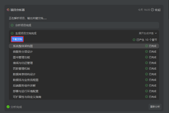 这工具简直是接手老项目的 “救命稻草”!它会对项目源码和配置进行深度解析,从系统架构、核心功能说明,到数据流走向、部署指南、可扩展性设计,每个关键维度都不放过,最后生成一份结构化的项目简介文档。上次接手一个 15 万行的电商项目,我用项目分析器扫了一遍,不到半小时就拿到了文档 —— 里面不仅有清晰的微服务调用链路图,还标注了每个模块的核心业务逻辑,连枚举类里每个值的业务含义、配置文件里关键参数的用途都写得明明白白。以前要花一周跟前任开发者反复沟通才能理清的项目,现在看文档 1 小时就全懂了,接入效率直接翻了 10 倍。