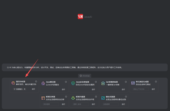 飞算JavaAI 最让我惊艳的,就是工具箱里的 “项目分析器” 功能 —— 完全戳中了 Java 开发者接手遗留项目的痛点。不用复杂配置,打开插件找到项目分析器,选择 “深度分析模式”,它就开始自动扫描整个项目源码和配置文件。我原本以为至少要等几小时,结果喝杯咖啡的功夫(精确到 28 分钟),一份 15 万字的完整项目文档直接生成在项目根目录下!