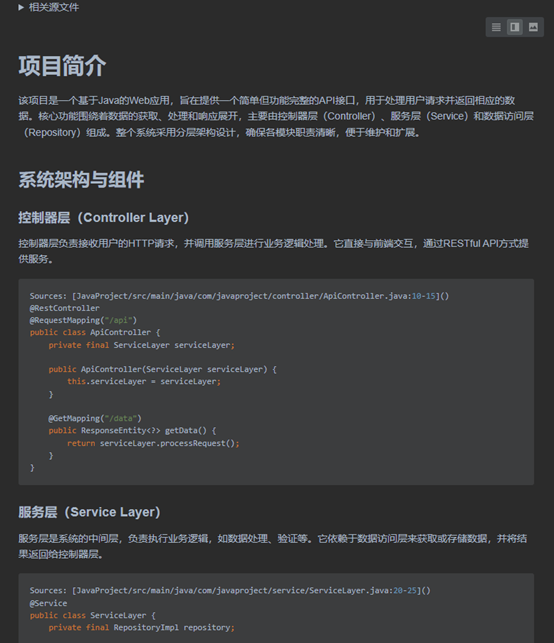 更惊喜的是细节覆盖:枚举类的每个值含义、常量类的用途、甚至 MyBatis 的 SQL 映射关系,文档里全有。以前我要花 3 天全局搜索才能搞懂的业务逻辑,现在对着文档 5 分钟就能理清。更关键的是,文档完全符合 Java 开发规范,自动生成的 Javadoc 注释包含功能描述、参数含义、返回值和异常说明,连if-else分支都有专属注释,直接解决了 “文档与代码不一致” 的行业痛点。