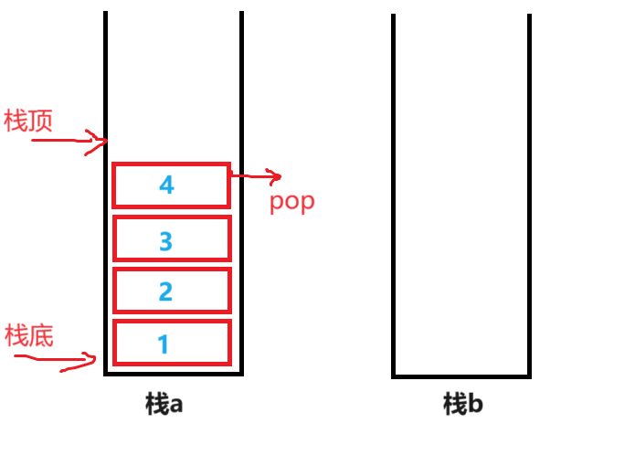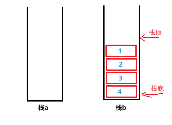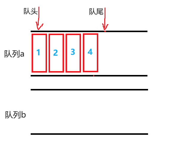 用栈实现队列也就是使用栈来实现先进先出的效果,该操作用一个栈是无法完成的,我们考虑用两个栈,栈a用来模拟入队操作,栈b来模拟出队操作。例如以下把1,2,3,4入队(入栈),现在要做的是实现出栈顺序为1,2,3,4。