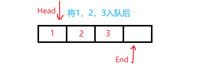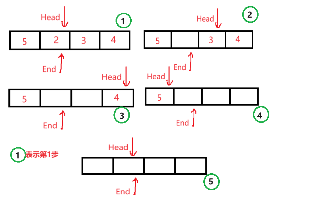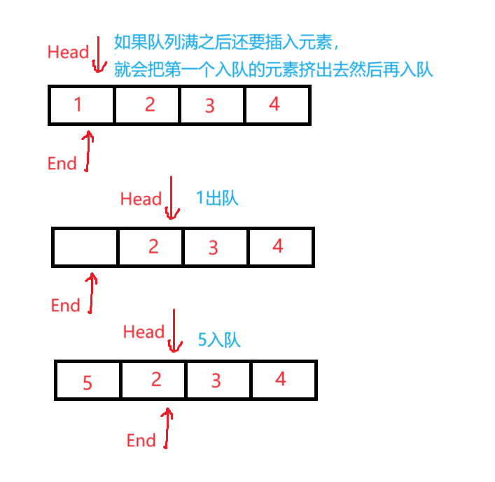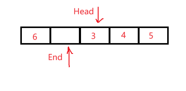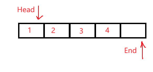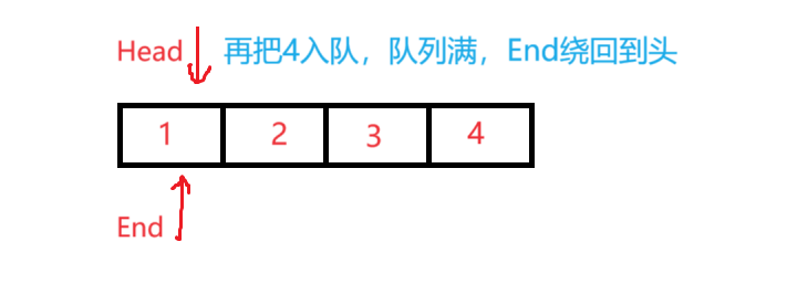 我们使用Head来储存队头下标,使用End来储存队尾元素的下一个空间的下标,那么当队列为空的时候,Head和End就指向同一个位置,等队满之后,End又绕回到头。如下: