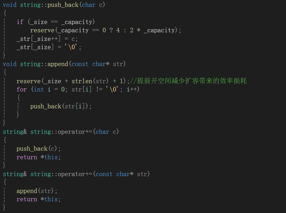reserve(_size + strlen(str) + 1);//提前开空间减少扩容带来的效率损耗