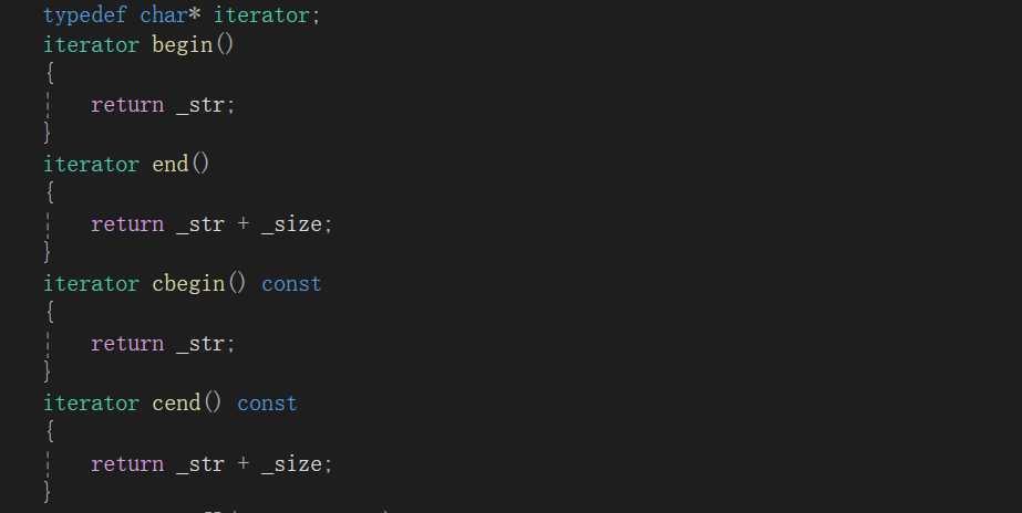 其中前三个接口核心在于push_back,可以先完成第三个接口,剩下两个接口对push_back复用即可。首先需要判断是否需要扩容,如果需要就进行扩容然后存放数据,不要忘记存放完数据后需要存入'\0'。如果函数是在类外实现的所以需要添加string::来指明类域。如下: