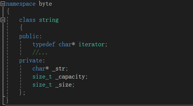 string本质可以理解为储存char类型的顺序表,其中string的迭代器用一个char*就可以解决。所以string类成员变量如下: