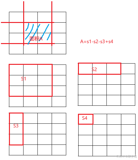 一块随机的面积若不考虑边界问题我们都可以把它分成四块已知前缀和的小矩阵。如上分解A=S1-S2-S3+S4,而这些面积已经储存在dp表中我们只需要找到它们的下标就能在dp表中找到。所以现在关键的是确定它们的下标位置,如下: