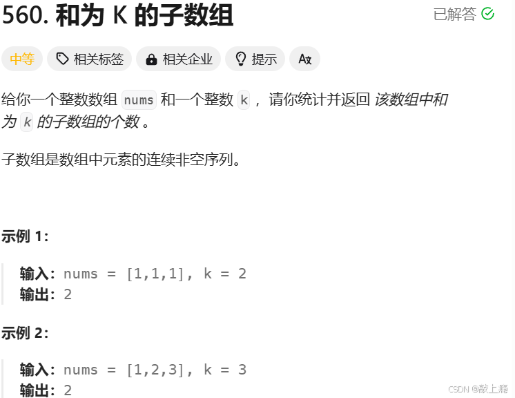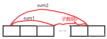 如图要使子数组v的和等于目标值k则一定有sum2-sum1=k,即有sum1=sum2-k。那么我们可以计算一下该数组元素的前缀和并在计算过程中进行满足条件的子数组进行记录。注意这里是需要在计算前缀和的过程中进行统计,而不是完成所有前缀和计算后统计。记i=0,我们从下标i往右依次遍历。
