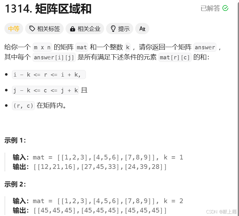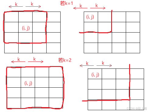 其中矩阵answer[i][j]记录的是mat矩阵中(i,j)位置往四面八方延伸k个元素得到的子矩阵的和。