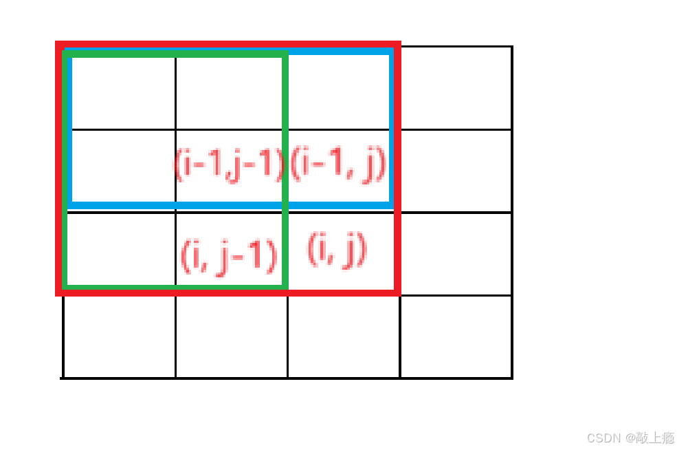 如上(i,j)位置的前缀和dp[i][j]=dp[i-1][j]+dp[i][j-1]-dp[i-1][j-1]+mat[i][j]。我们使用两层for循环就可以将所有位置的前缀和填到dp表中。