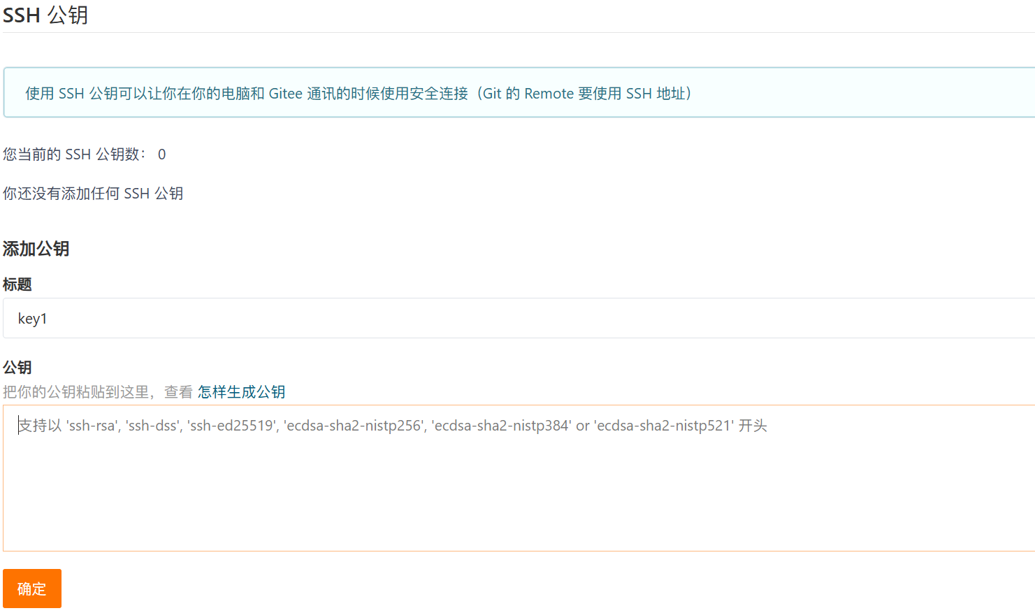 然后复制id_rsa.pub文件的内容,粘贴到gitee公钥配置的位置,点击确定生成公钥。完成以上操作后再进行克隆。