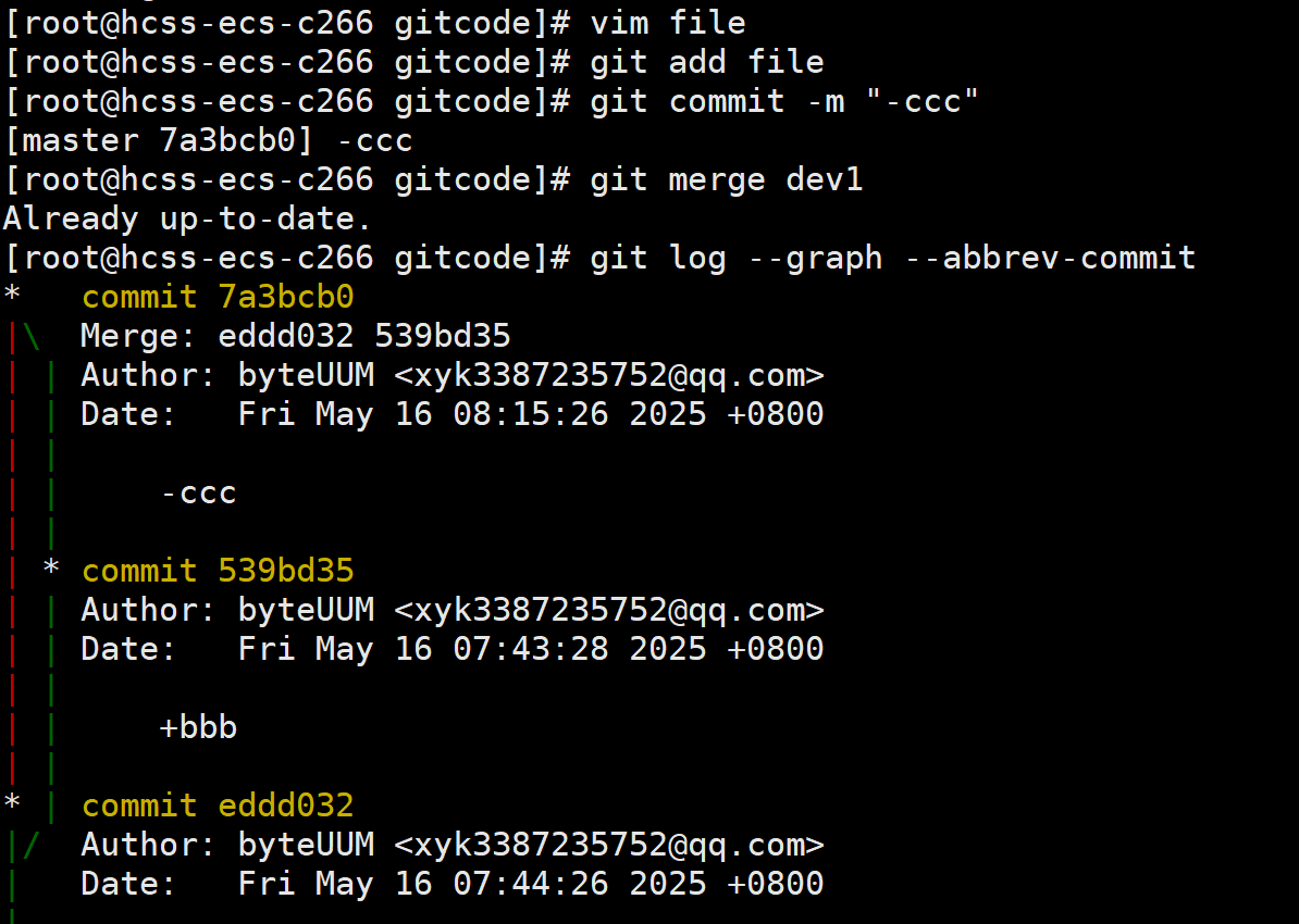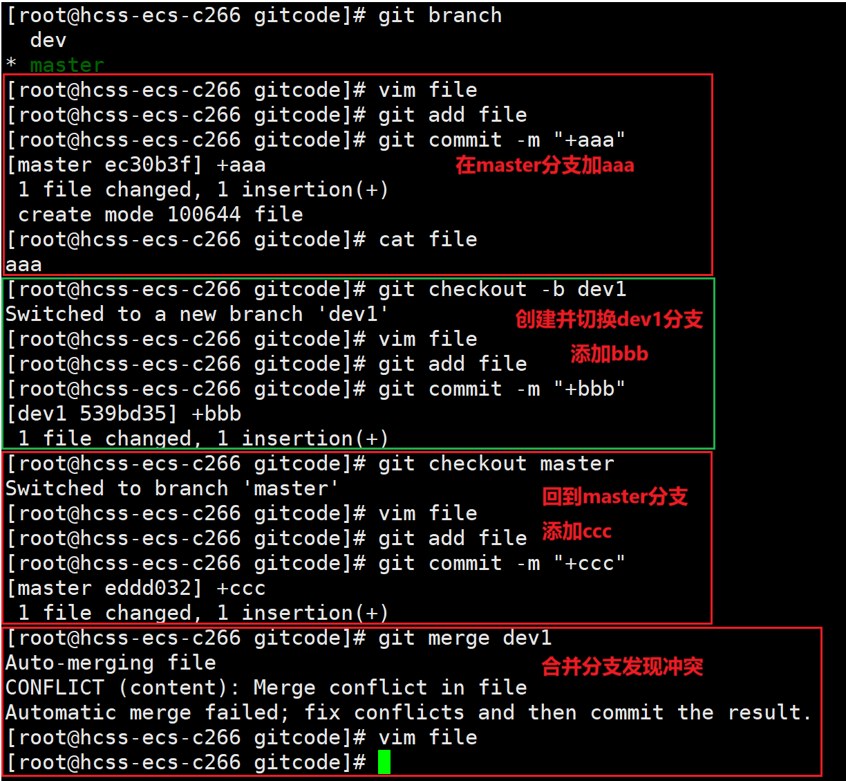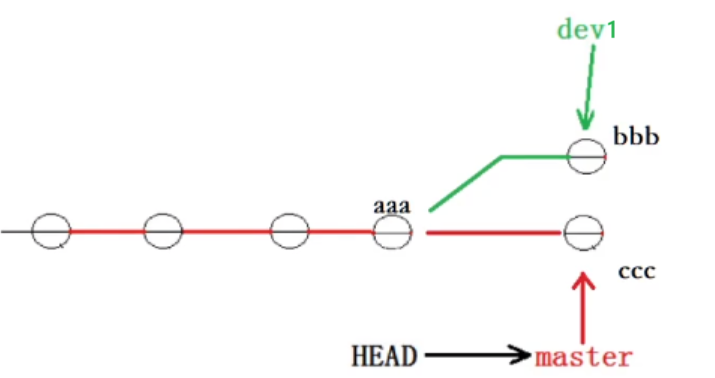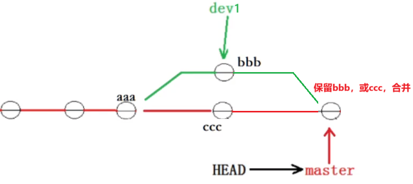 现在需要合并,可以在master分支上删除ccc,然后进行add,commit,再进行合并。或者在dev1分支上删除bbb,然后进行add,commit,再合并。