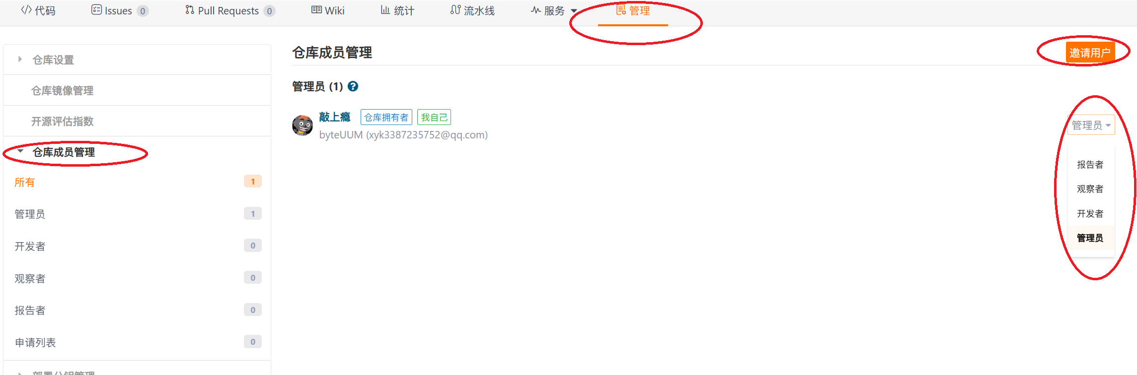管理员 | 创建 Issue、评论、Clone 和 Pull 仓库、打包下载代码、创建 Pull Request、 创建分支、推送分支、删除分支、创建 Issue/Pull Request 标签(里程碑)、创建 Wiki、 添加仓库成员、强制推送分支、编辑仓库属性、可上传附件,可删除自己或他人上传的附件、 不能转移/清空/删除仓库 |