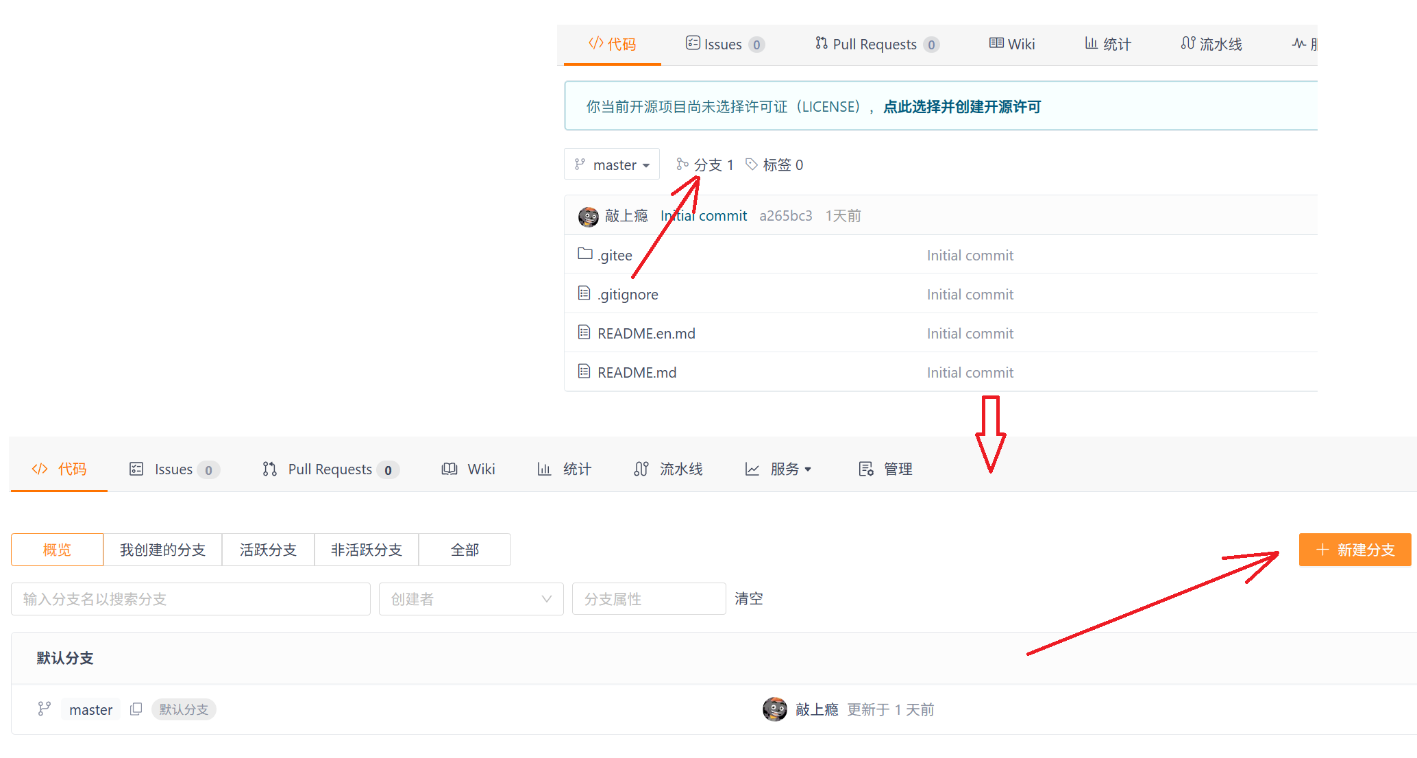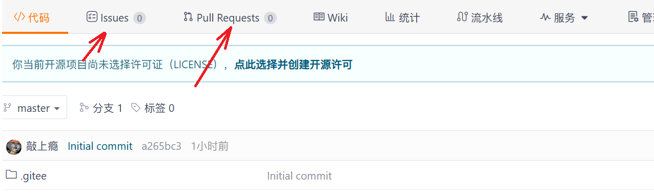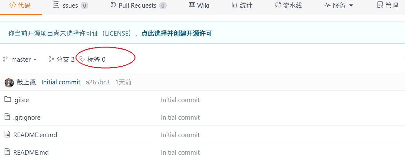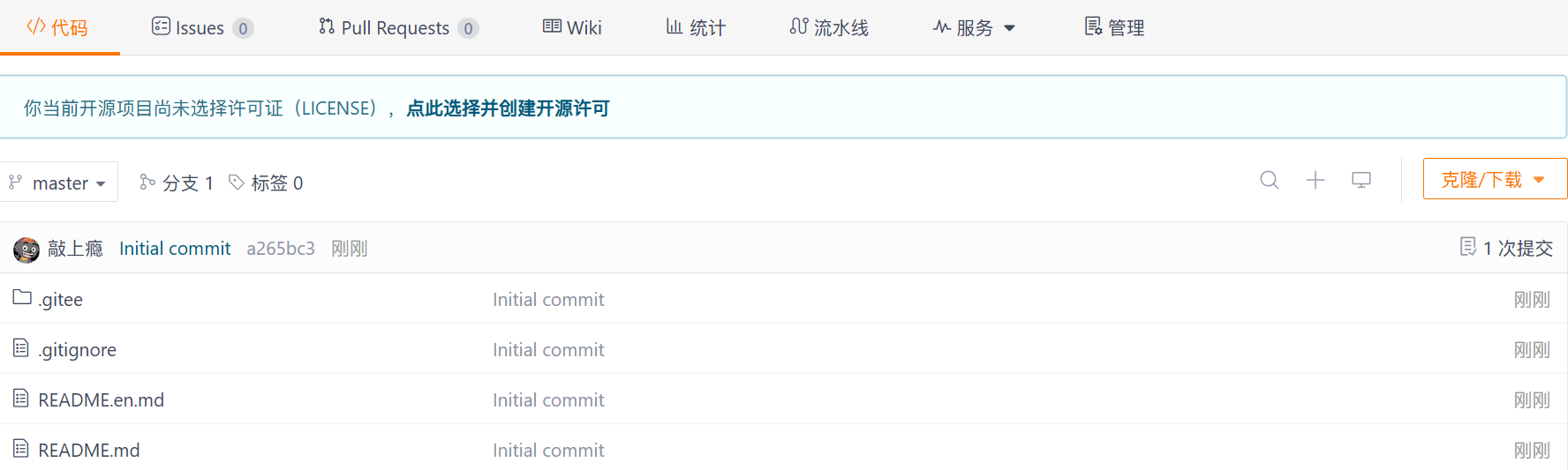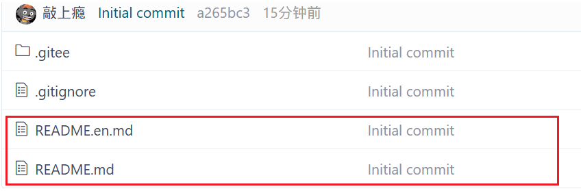 创建仓库并打开,我们可以发现它比本地仓库多了三个文件,.gitfnore,README.en.md,README.md,如下: