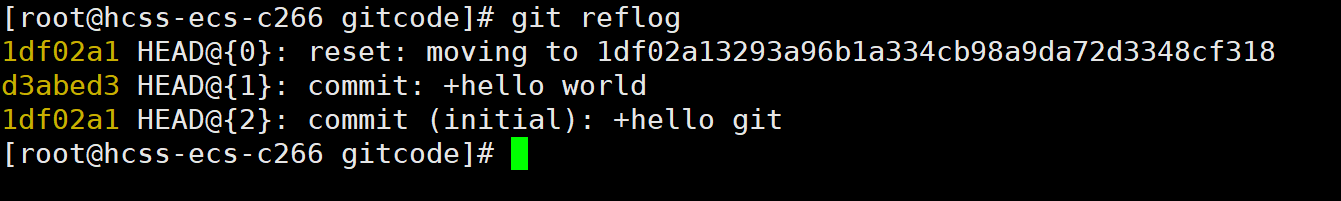里面记录你做过的各种操作,其中黄色高亮的为<commit-id>,“缩短版”的,但依旧能对得上。如下: