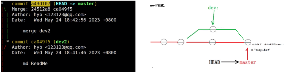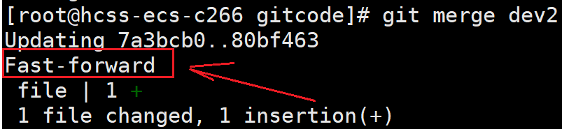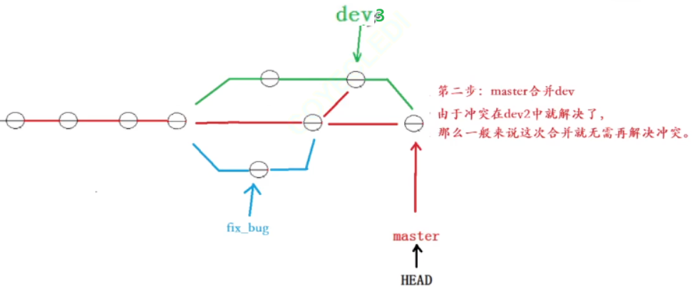 如果我们创建分支dev2并且不产生冲突,进行合并,如下:
