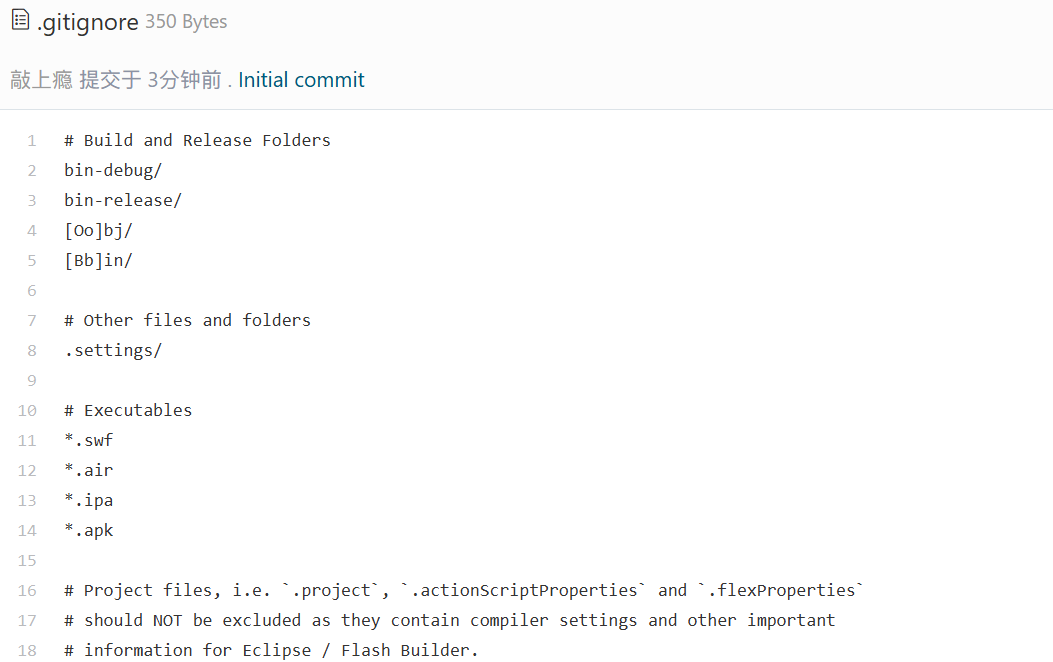 我们可以手动对.gitgnore文件进行编辑,如果添加!a.swf表示a.swf文件不可被忽略。因为我们通常都不会把文件一个一个的推送到远程,而是批量的推送,所以有些不重要的,无关的文件就会被推送上去,有了.gitgnore文件后起到了过滤的效果。