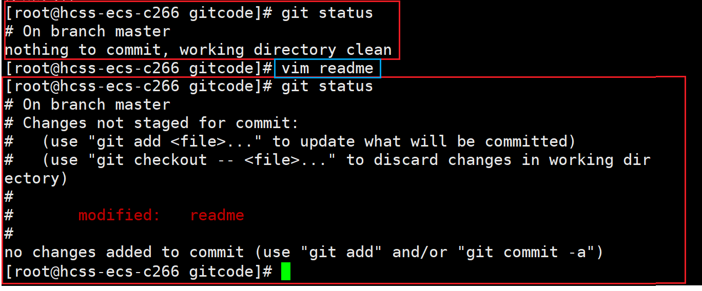 Git能追踪到文件readme被修改,并显示出“建议进行 git add和git commit”的字眼。
