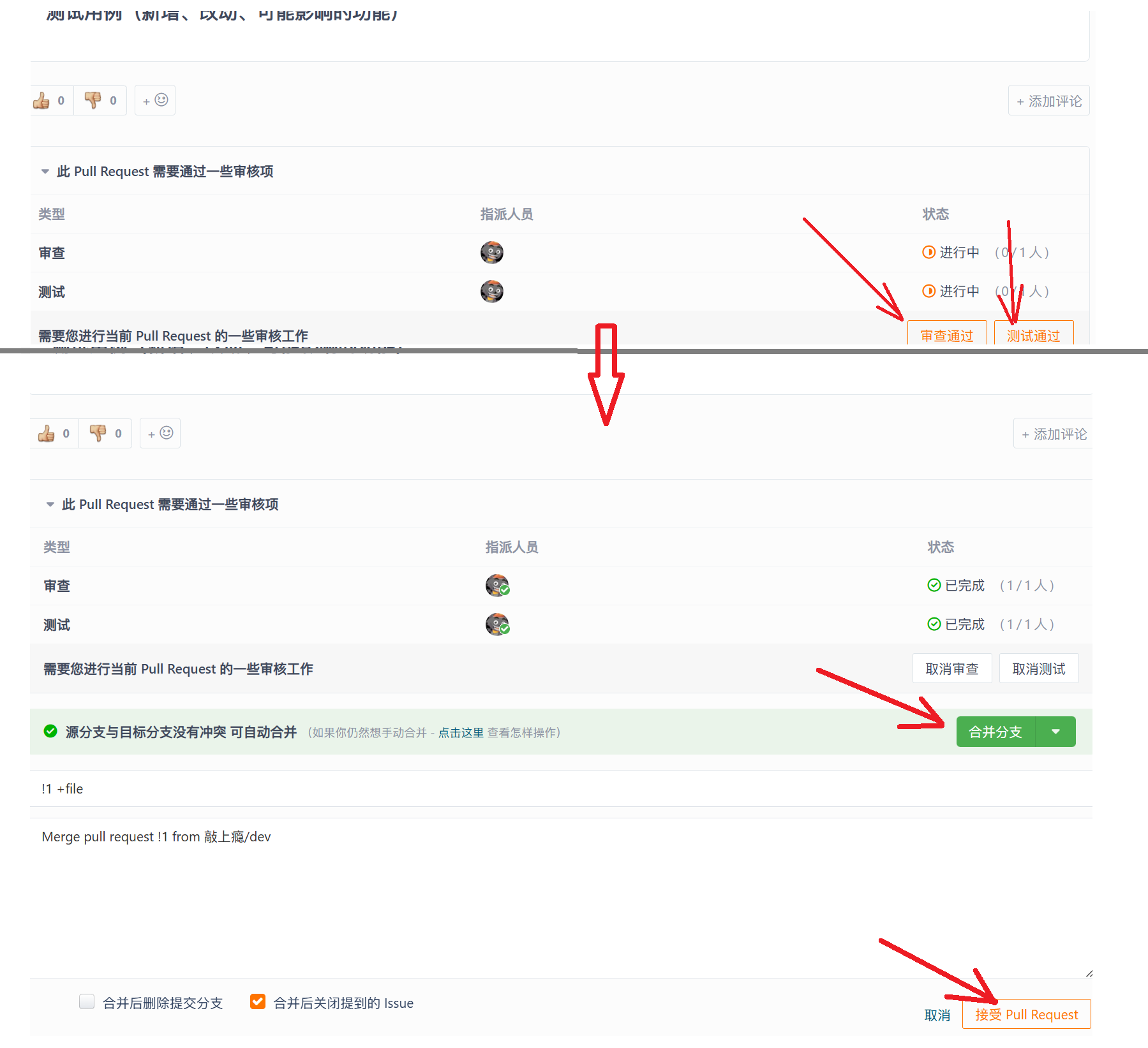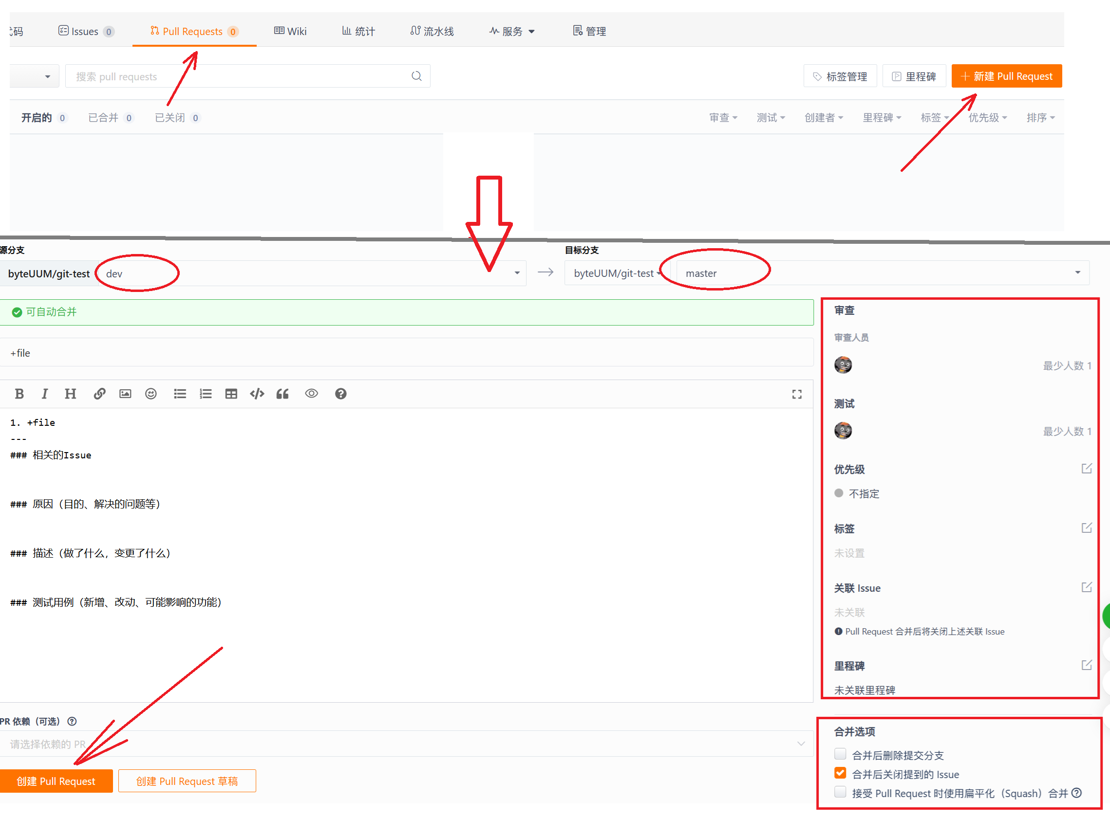 三、远程操作:申请合并单把dev1和dev2合并到master主分支。