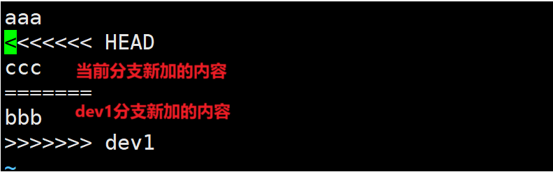 打开冲突文件file,可以发现git给我们添加<<<<<HEAD,=========,>>>>>>>dev这样的字眼,用来把两个文件新增内容区分开: