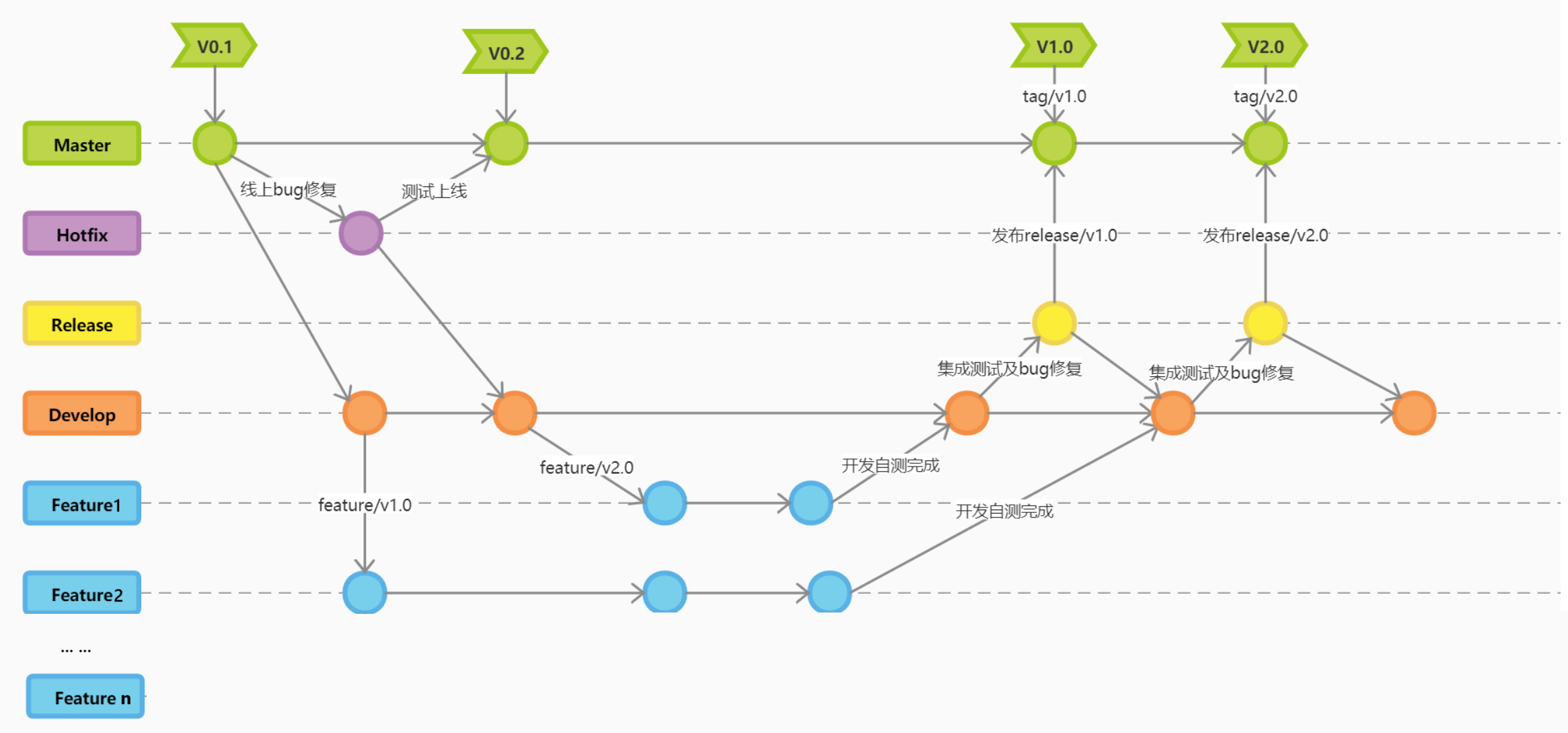 Git分支有很多模型,其中Git Flow模型被广泛使用,如下: