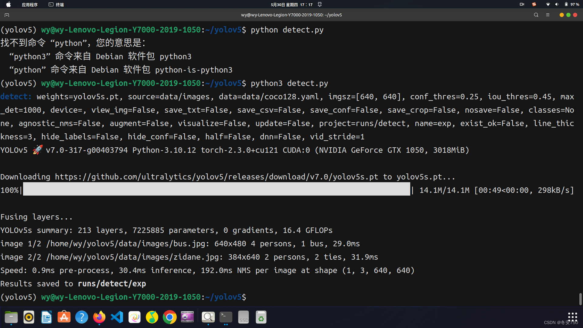 会下载点东西,不用管,最后会输出一行 Results saved to runs/detect/exp