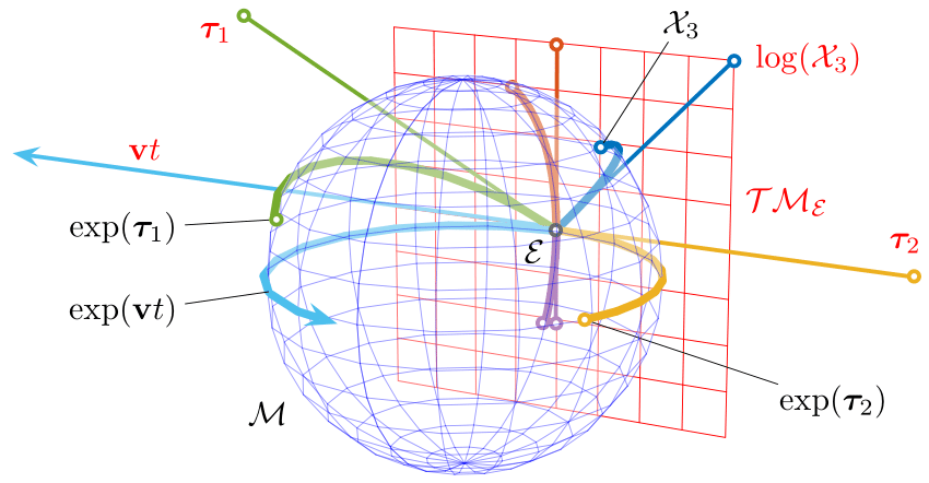 实数是一条直线,但SO(3)不是,它在ℝ³ˣ³里形成一个弯曲的流形。这个流形是连续的、可微的,你可以在上面定义距离。想在这个弯曲的表面上移动,就得沿着切线方向走,这就引出了切空间的概念。