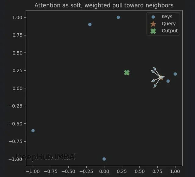 查询(★)感受到来自附近键(●)的加权拉力,箭头长度正比于注意力权重。输出(✖)就是邻居们的加权重心。